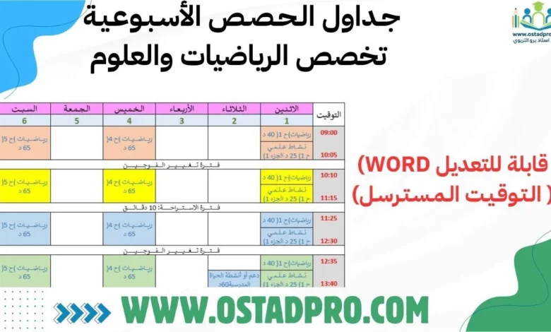 يسرنا في موقع أستاذ برو أن نقدم جـداول الـحـصـص الأسـبـوعـيـة تخصص الرياضيات والعلوم (قابلة للتعديل WORD) ( الـتـوقـيـت الـمـسـتـرسـل)