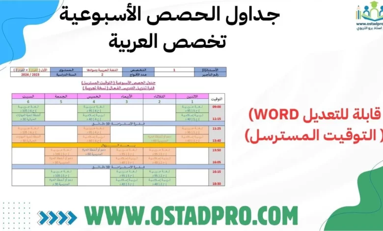 يسرنا في موقع أستاذ برو أن نقدم جـداول الـحـصـص الأسـبـوعـيـة تخصص العربية (قابلة للتعديل WORD) ( الـتـوقـيـت الـمـسـتـرسـل)