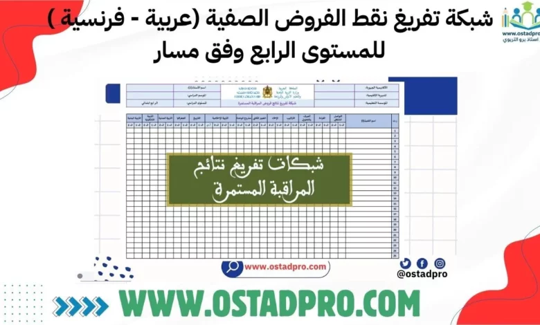 شبكة تفريغ نقط الفروض الصفية (عربية – فرنسية ) للمستوى الرابع وفق مسارشبكة تفريغ نقط الفروض الصفية (عربية – فرنسية ) للمستوى الرابع وفق مسارشبكة تفريغ نقط الفروض الصفية (عربية – فرنسية ) للمستوى الرابع وفق مسار