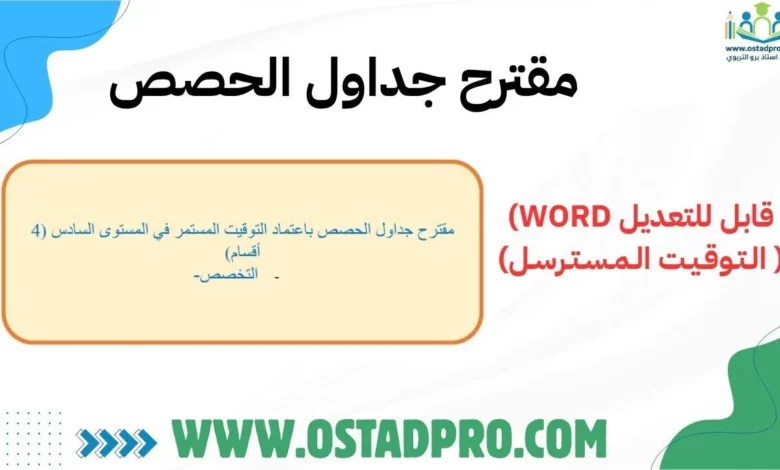 يسرنا في موقع أستاذ برو أن نقدم مقترح جداول الحصص (قابل للتعديل WORD) باعتماد التوقيت المستمر في المستوى السادس (4 أقسام)