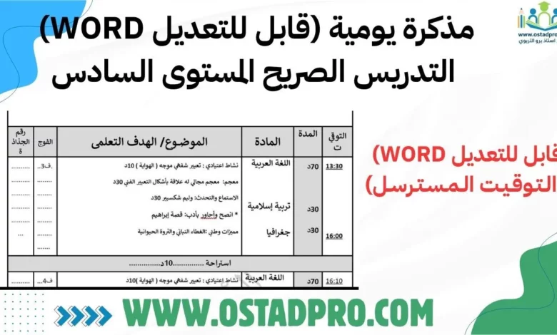 مذكرة يومية (قابل للتعديل WORD) : التدريس الصريح المستوى السادس